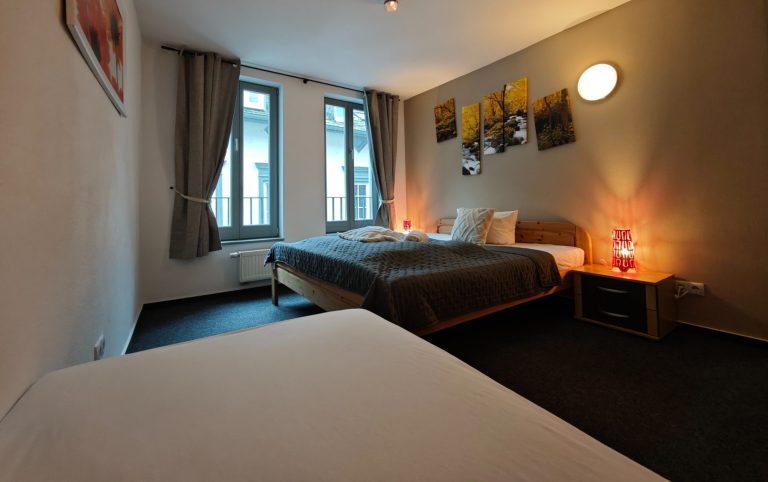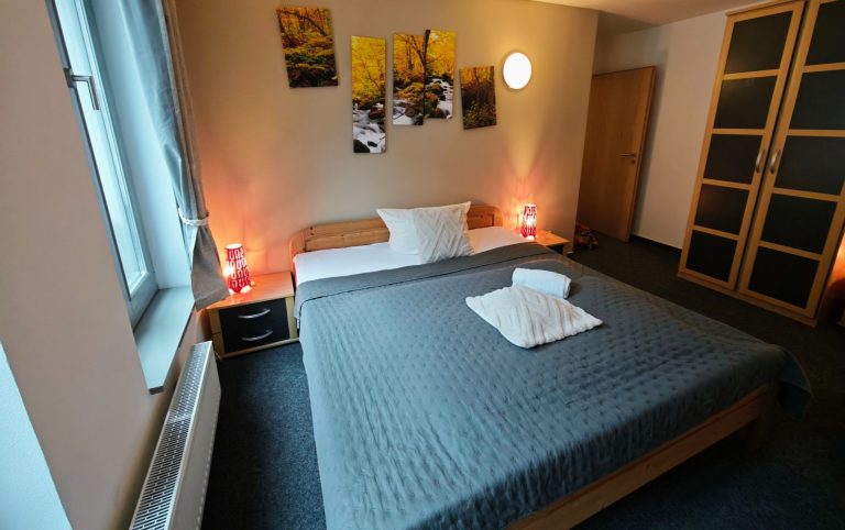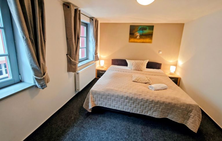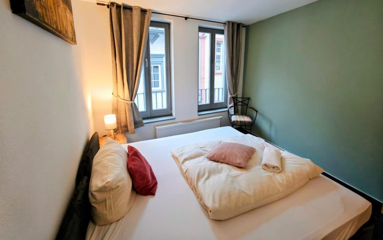 Auch Schlafzimmer 2 der Ferienwohnung ist mit einem komfortablen Doppelbett ausgestattet und bietet eine ruhige Rückzugsmöglichkeit. Das Fenster mit Blick auf die Altstadt verleihen dem Raum eine freundliche, helle Atmosphäre.